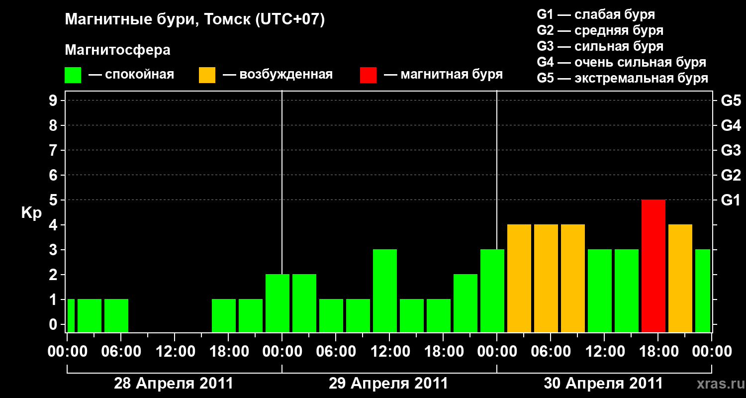 Изменения геомагнитного индекса Kp с 28 по 30 апреля 2011 года для средних широт