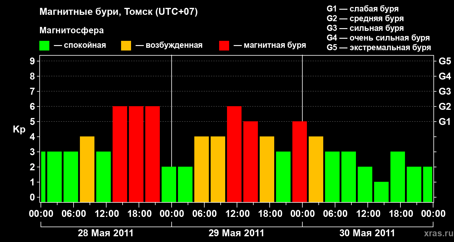 Изменения геомагнитного индекса Kp с 28 по 30 мая 2011 года для средних широт