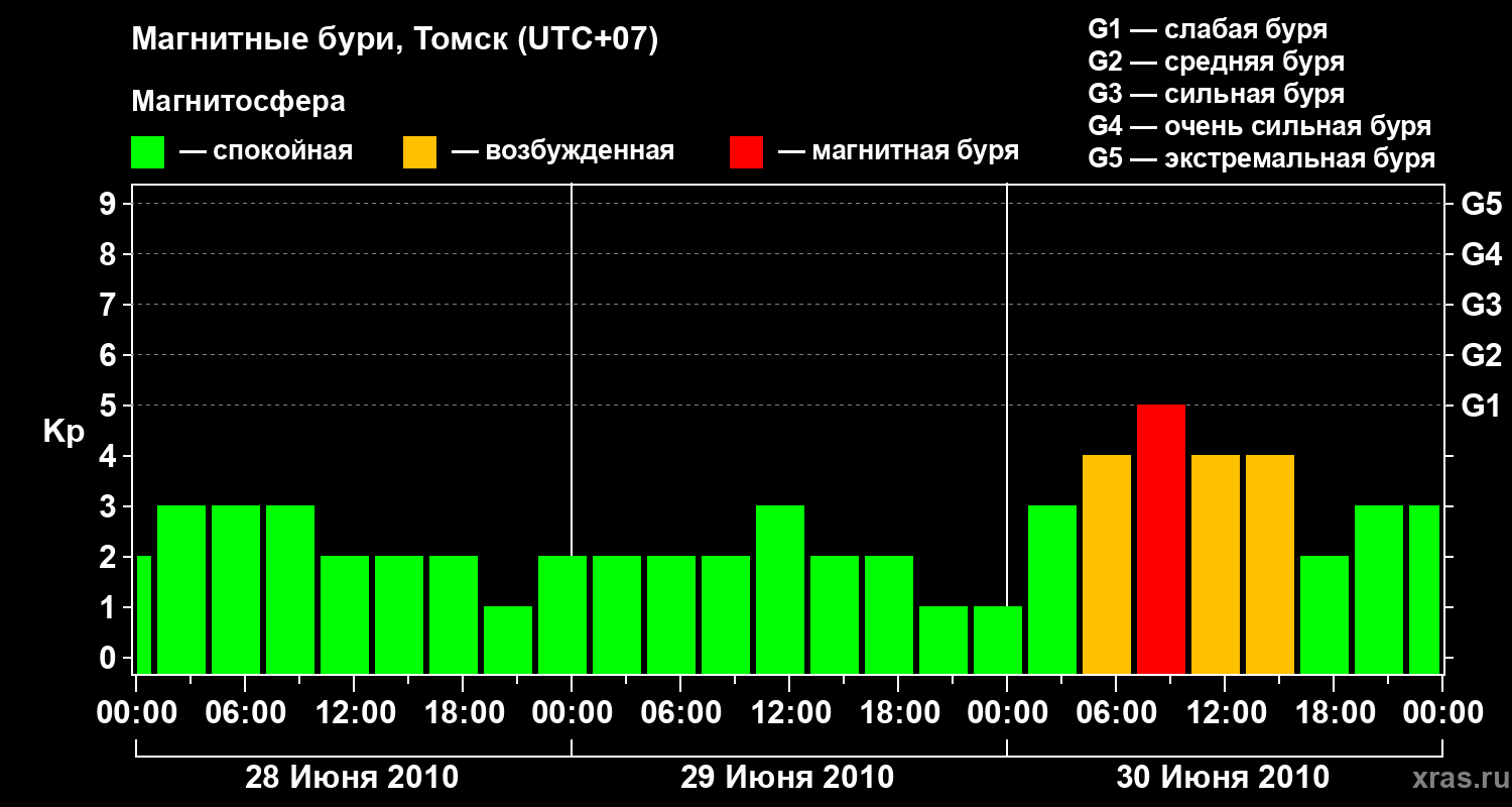 Изменения геомагнитного индекса Kp с 28 по 30 июня 2010 года для средних широт