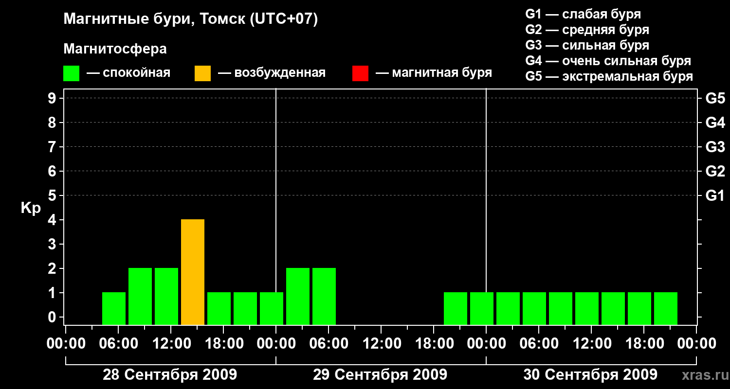 Изменения геомагнитного индекса Kp с 28 по 30 сентября 2009 года для средних широт