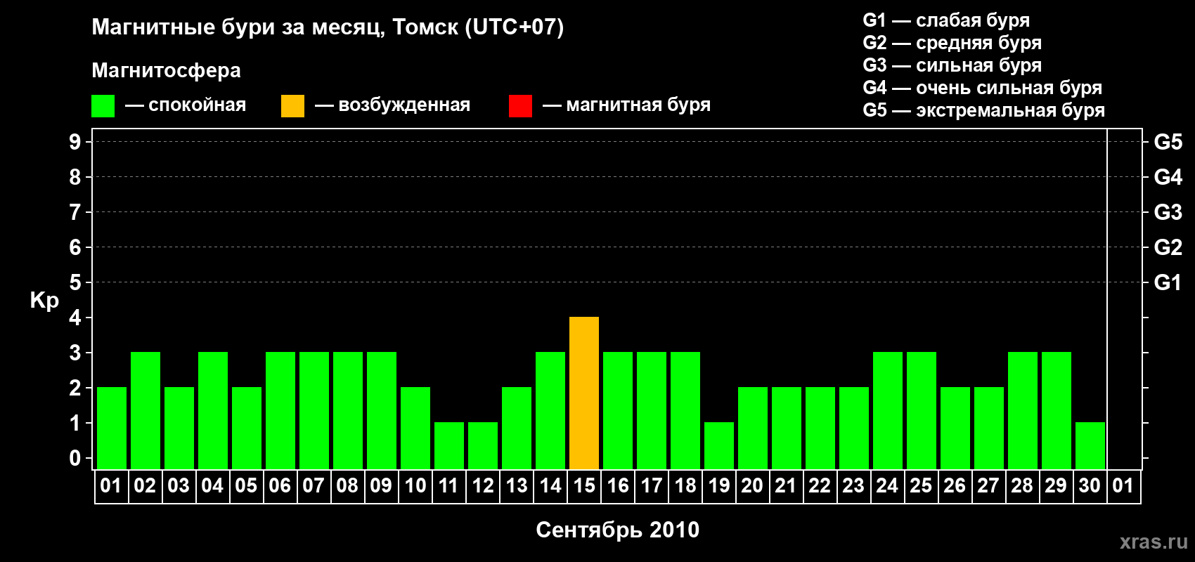 Изменения максимального суточного геомагнитного индекса Kp в сентябре 2010 года для средних широт