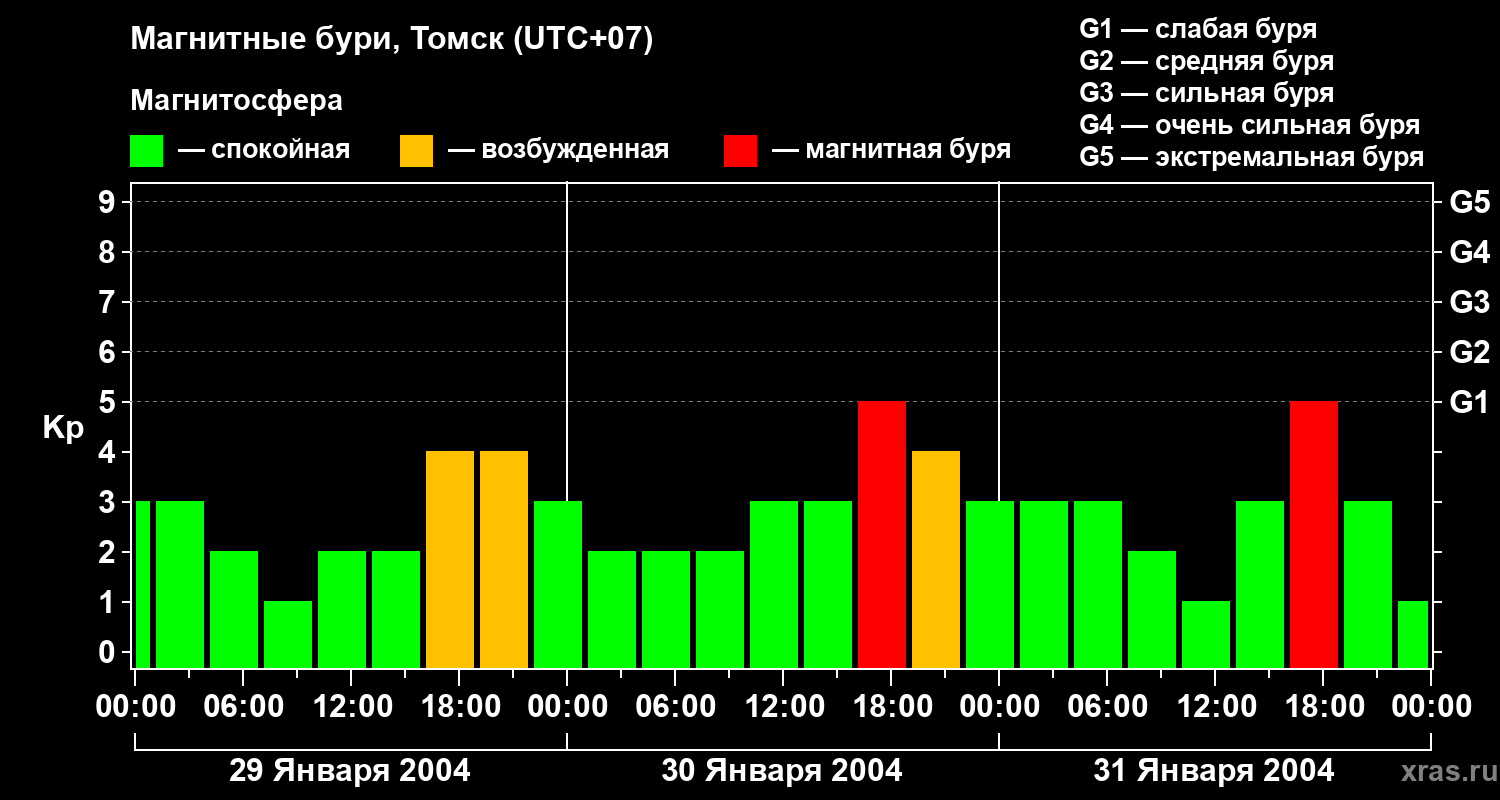 Изменения геомагнитного индекса Kp с 29 по 31 января 2004 года для средних широт
