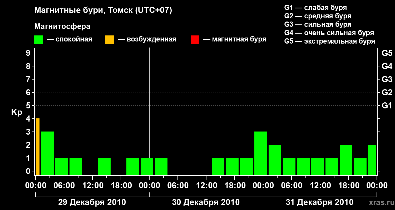 Изменения геомагнитного индекса Kp с 29 по 31 декабря 2010 года для средних широт