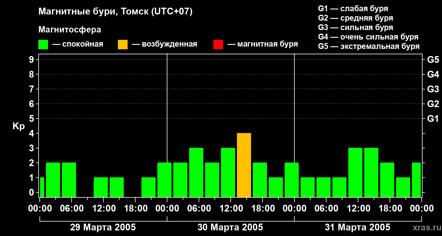 Изменения геомагнитного индекса Kp с 29 по 31 марта 2005 года для средних широт