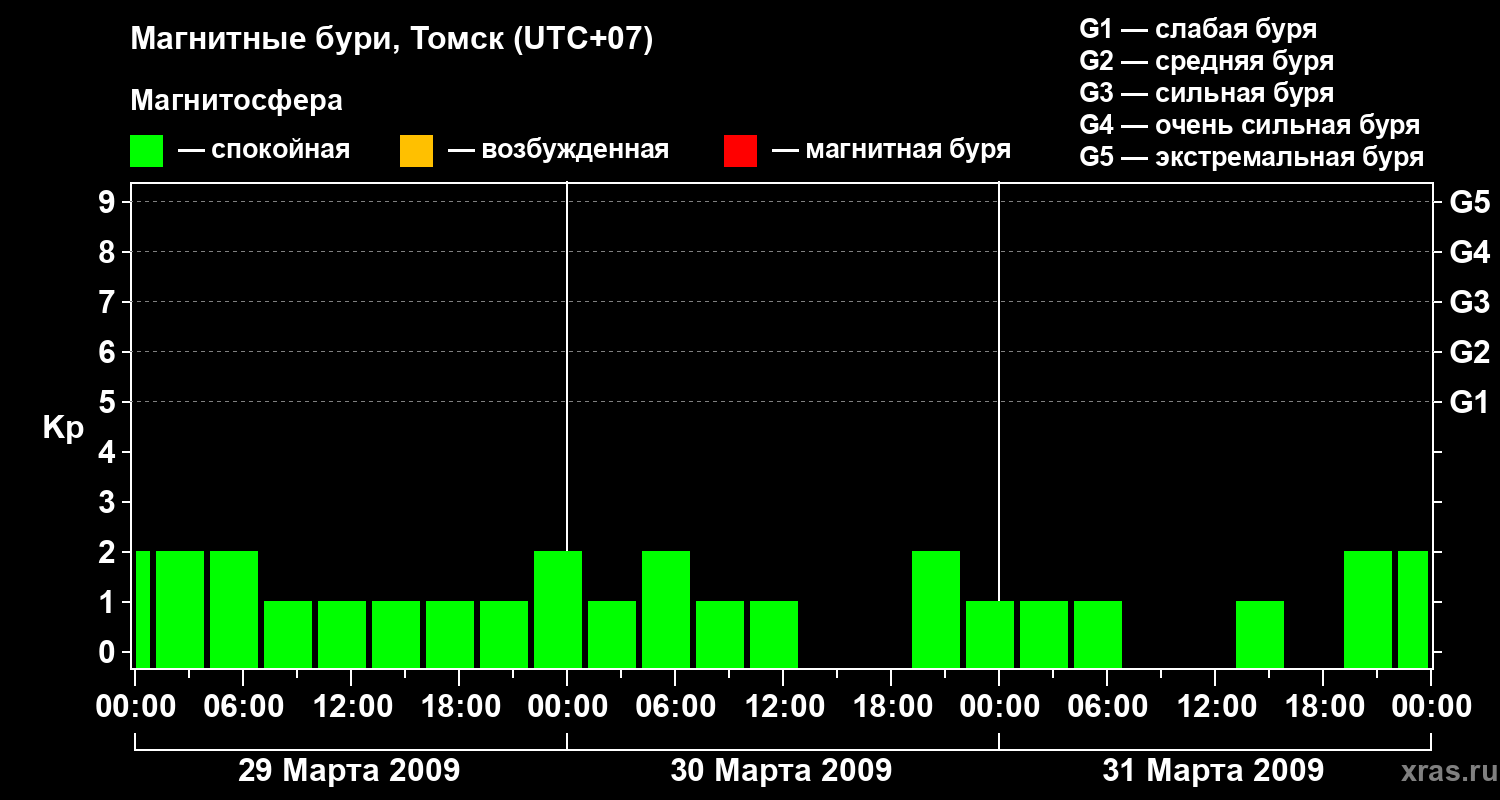 Изменения геомагнитного индекса Kp с 29 по 31 марта 2009 года для средних широт