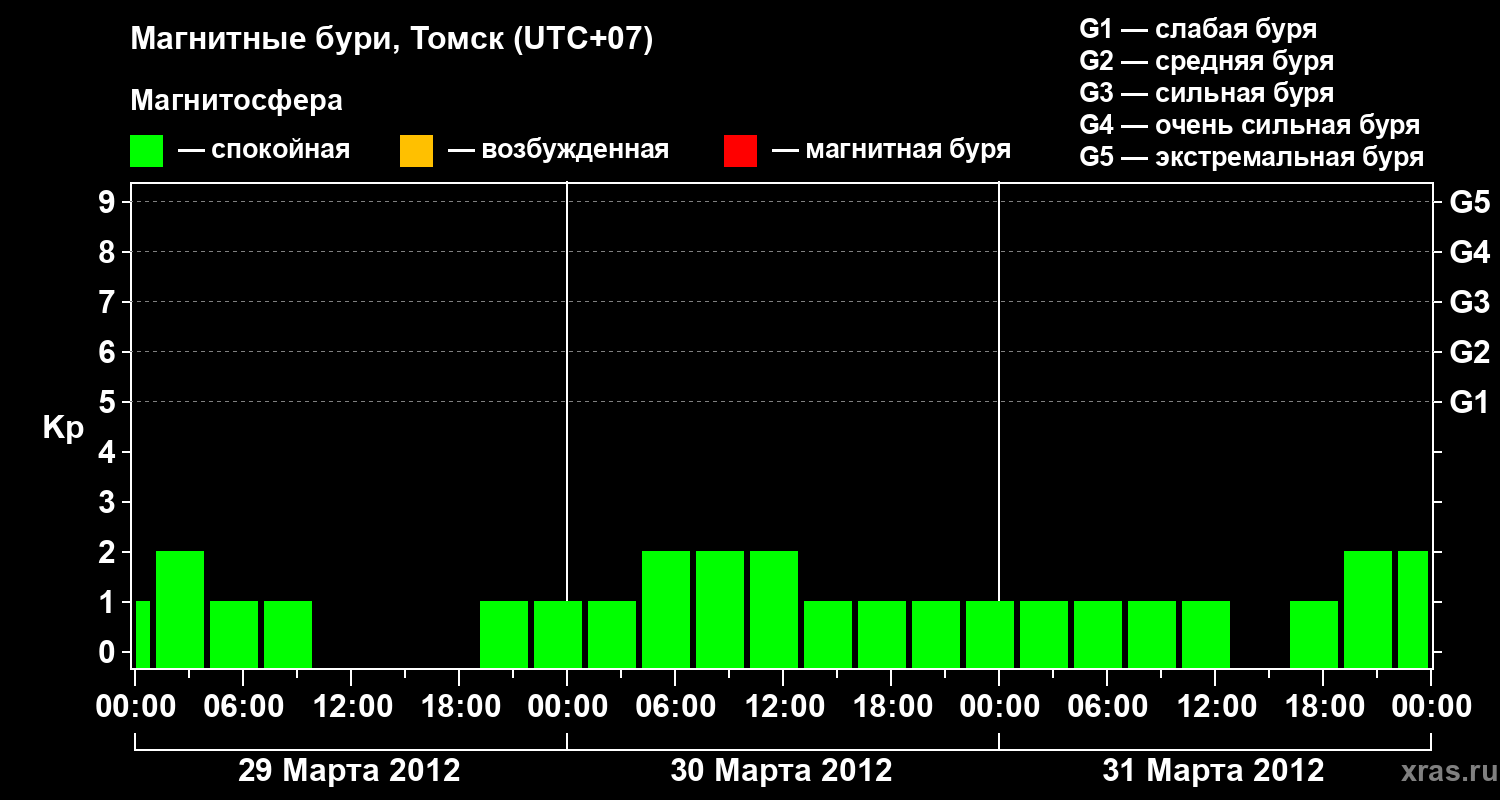 Изменения геомагнитного индекса Kp с 29 по 31 марта 2012 года для средних широт