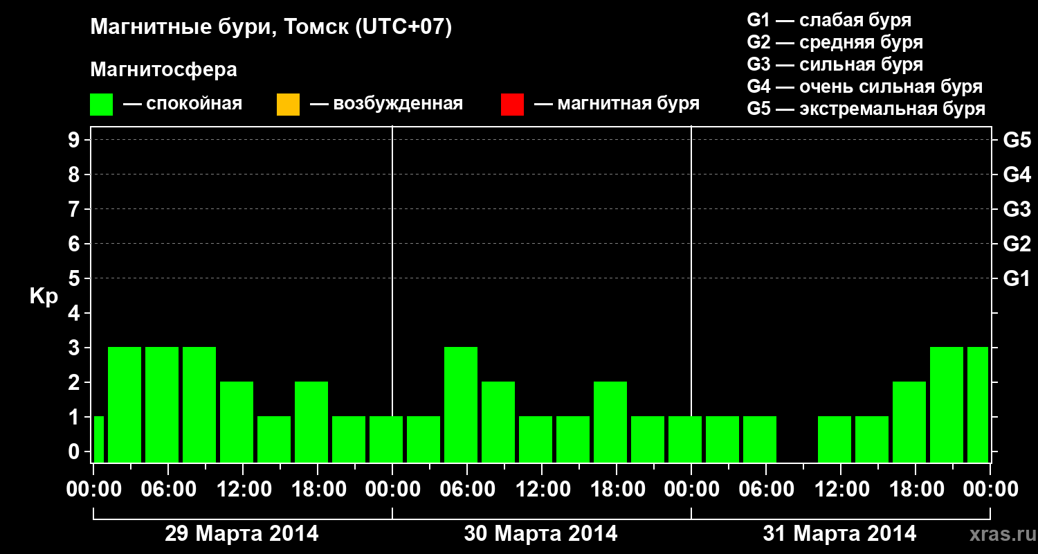 Изменения геомагнитного индекса Kp с 29 по 31 марта 2014 года для средних широт