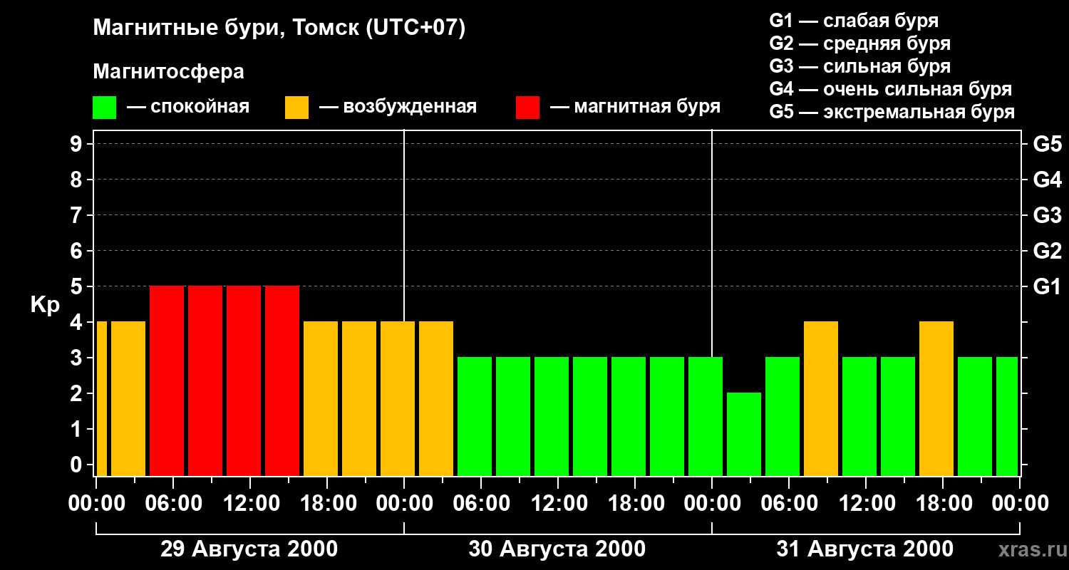 Изменения геомагнитного индекса Kp с 29 по 31 августа 2000 года для средних широт