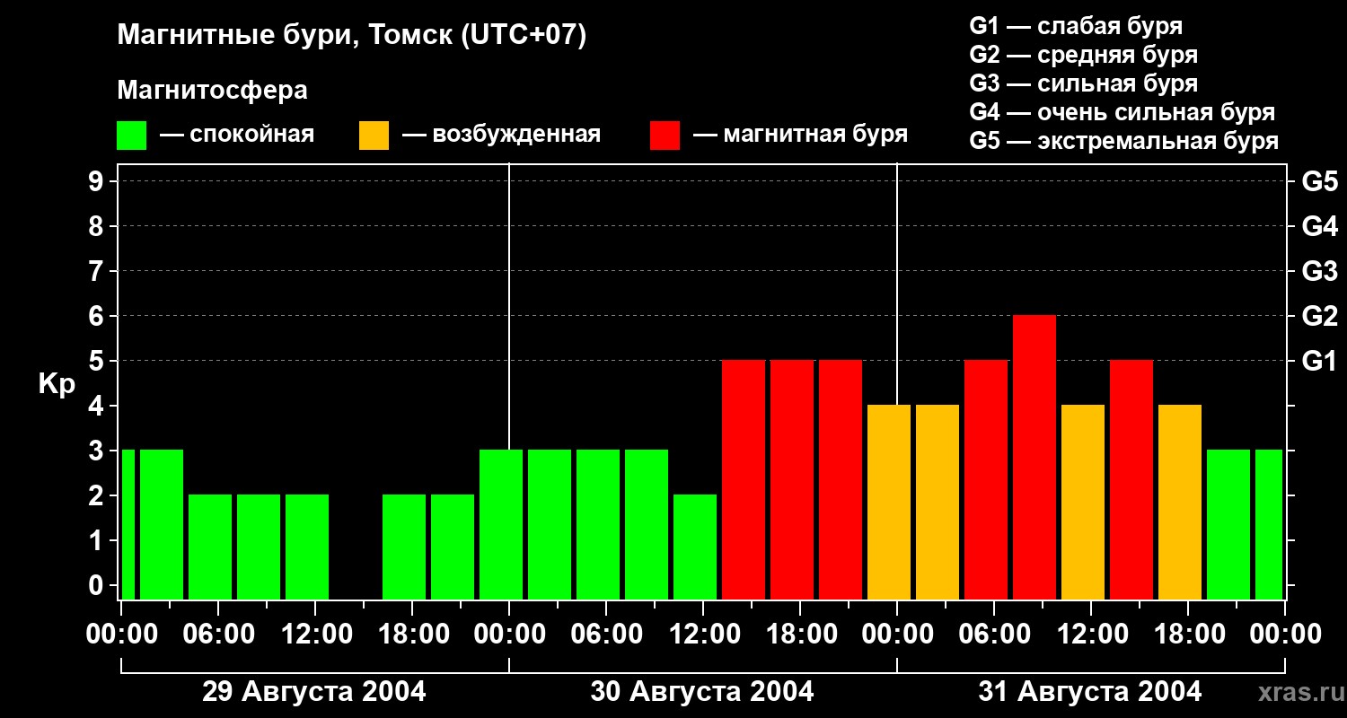 Изменения геомагнитного индекса Kp с 29 по 31 августа 2004 года для средних широт