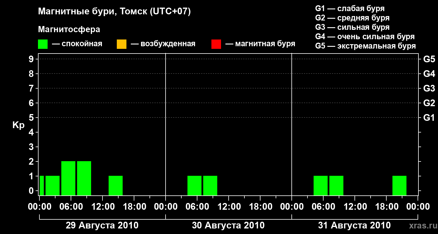 Изменения геомагнитного индекса Kp с 29 по 31 августа 2010 года для средних широт