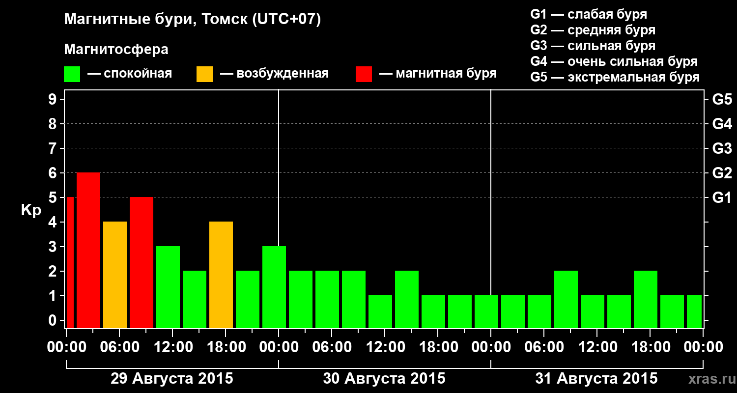 Изменения геомагнитного индекса Kp с 29 по 31 августа 2015 года для средних широт