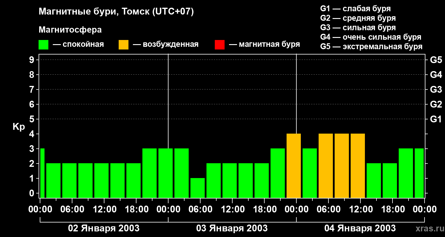Изменения геомагнитного индекса Kp с 2 по 4 января 2003 года для средних широт