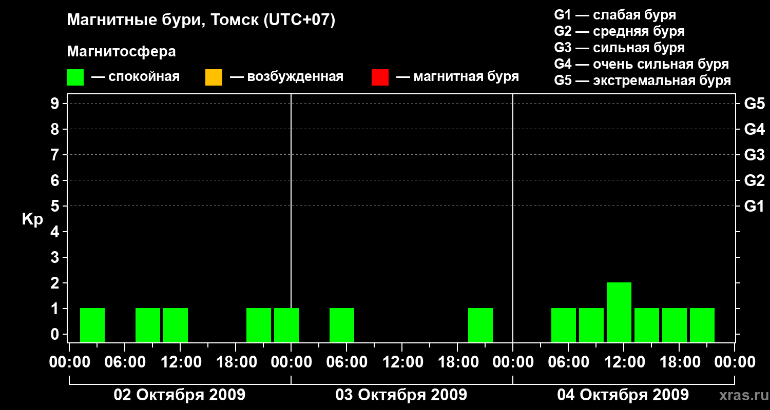 Изменения геомагнитного индекса Kp с 2 по 4 октября 2009 года для средних широт
