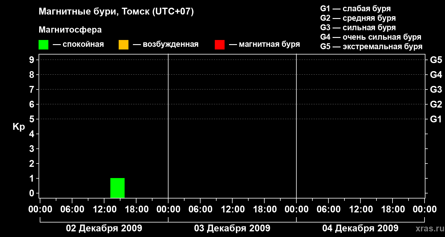 Изменения геомагнитного индекса Kp с 2 по 4 декабря 2009 года для средних широт