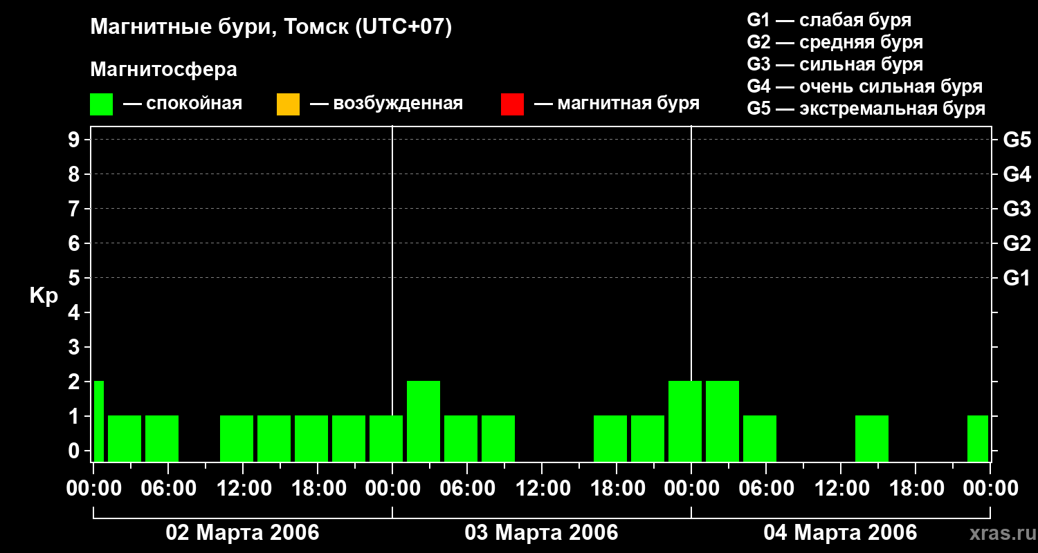 Изменения геомагнитного индекса Kp с 2 по 4 марта 2006 года для средних широт