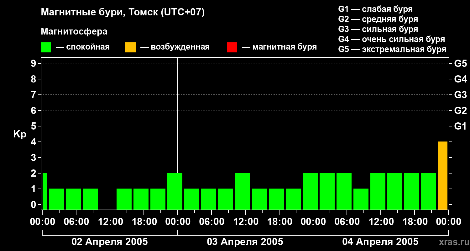 Изменения геомагнитного индекса Kp с 2 по 4 апреля 2005 года для средних широт