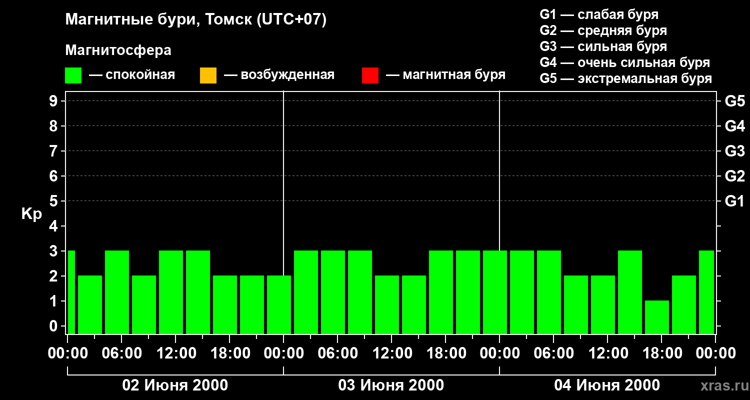 Изменения геомагнитного индекса Kp с 2 по 4 июня 2000 года для средних широт