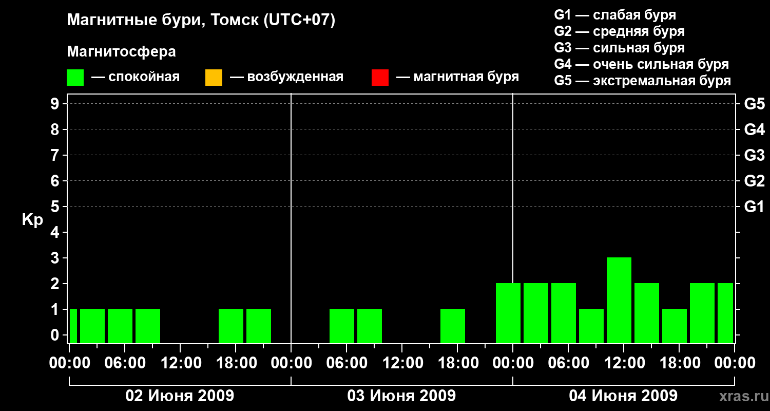 Изменения геомагнитного индекса Kp с 2 по 4 июня 2009 года для средних широт