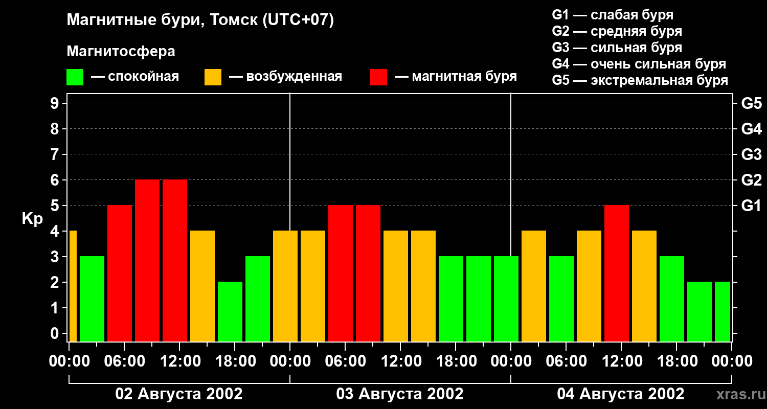 Изменения геомагнитного индекса Kp с 2 по 4 августа 2002 года для средних широт