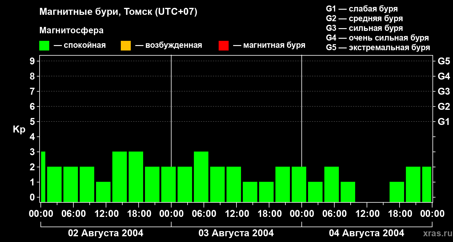 Изменения геомагнитного индекса Kp с 2 по 4 августа 2004 года для средних широт