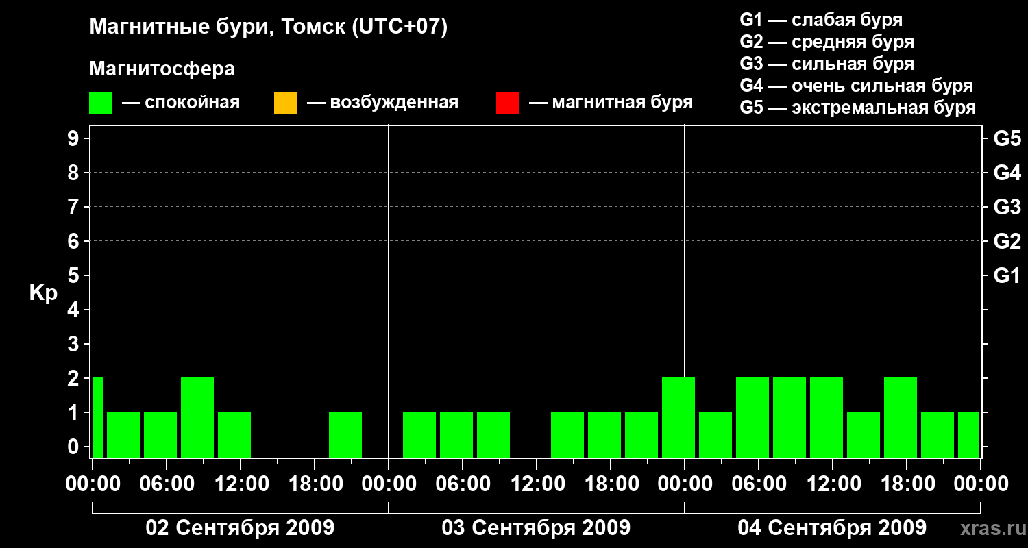 Изменения геомагнитного индекса Kp с 2 по 4 сентября 2009 года для средних широт