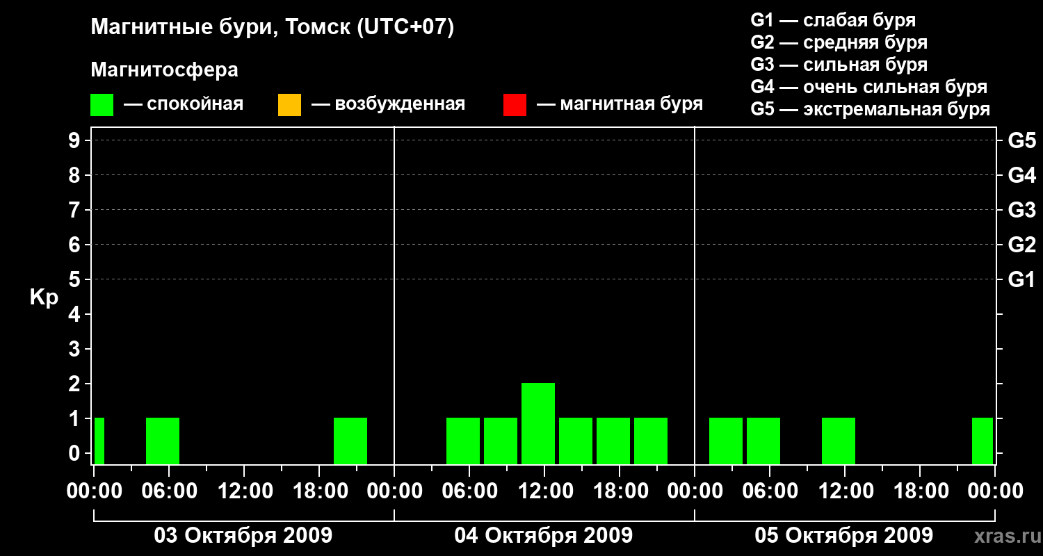 Изменения геомагнитного индекса Kp с 3 по 5 октября 2009 года для средних широт