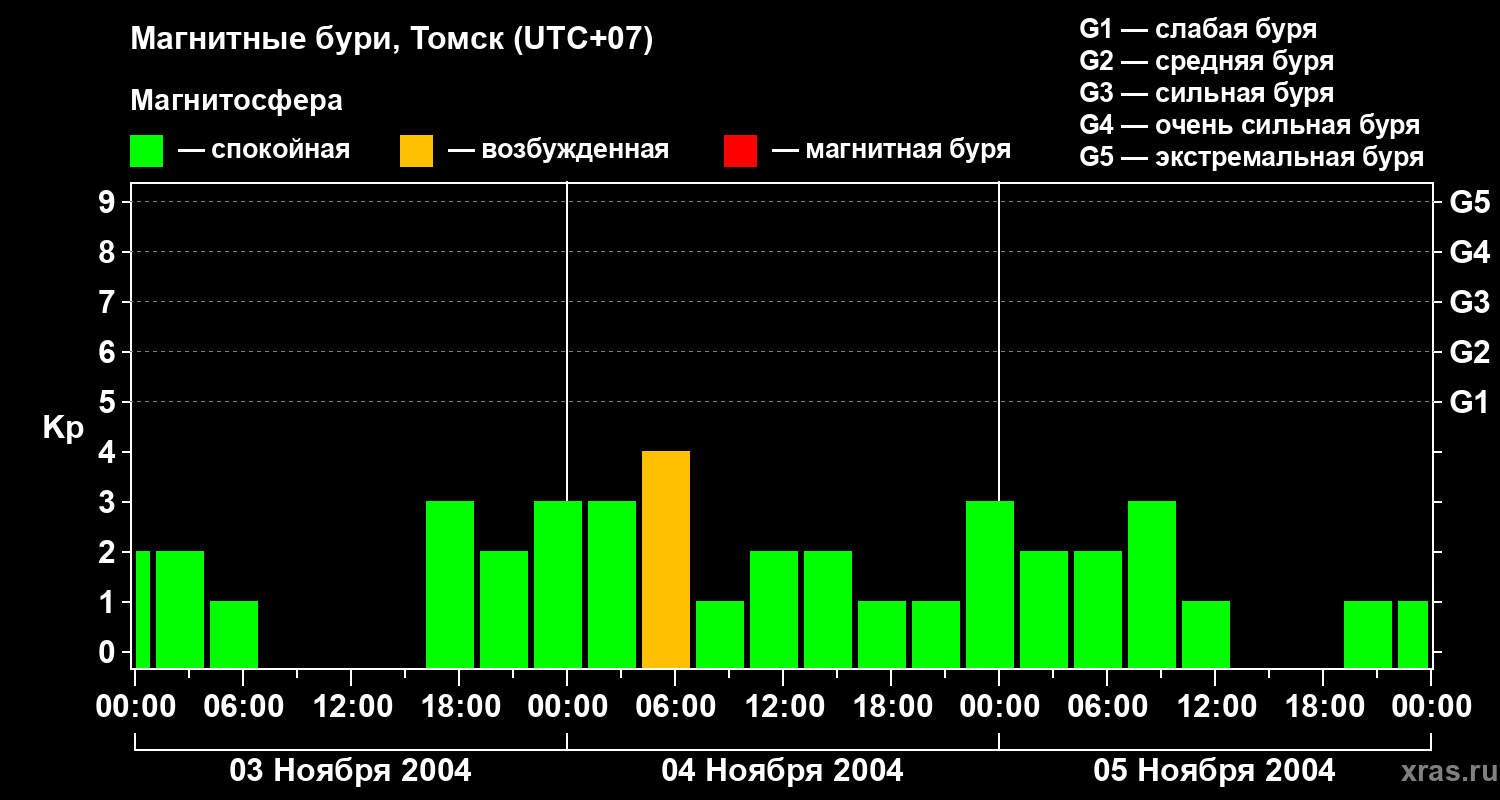 Изменения геомагнитного индекса Kp с 3 по 5 ноября 2004 года для средних широт