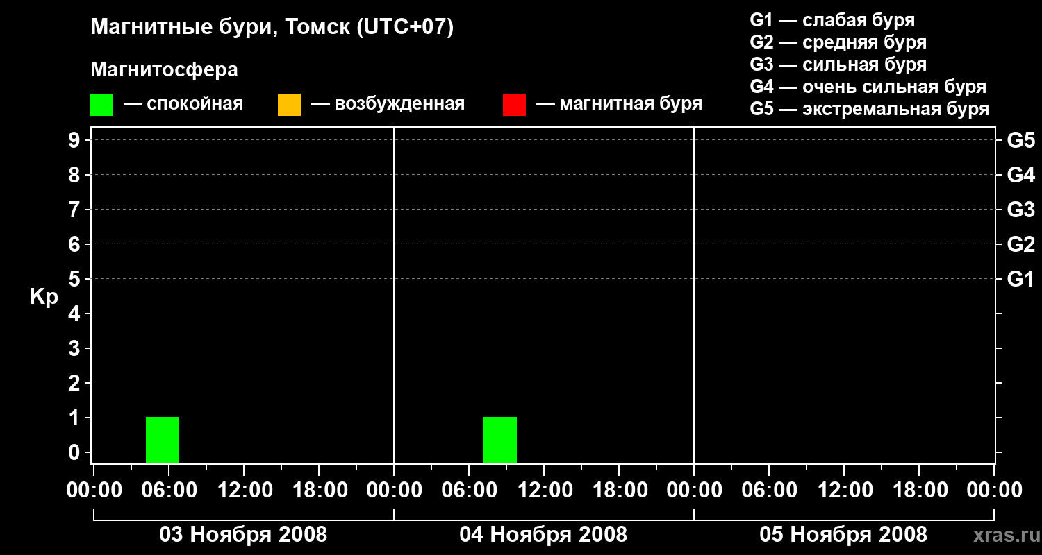 Изменения геомагнитного индекса Kp с 3 по 5 ноября 2008 года для средних широт