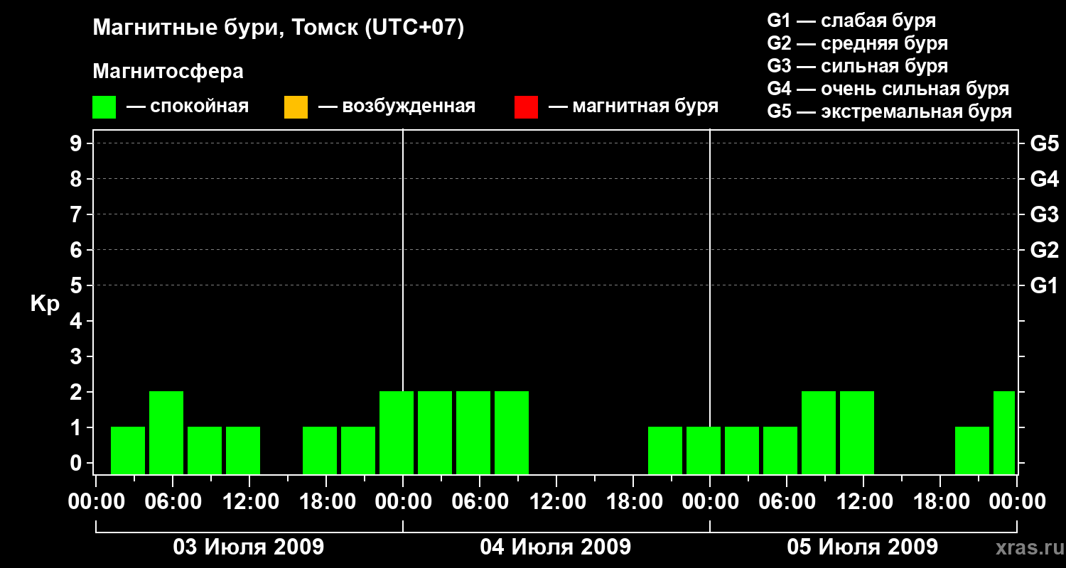 Изменения геомагнитного индекса Kp с 3 по 5 июля 2009 года для средних широт