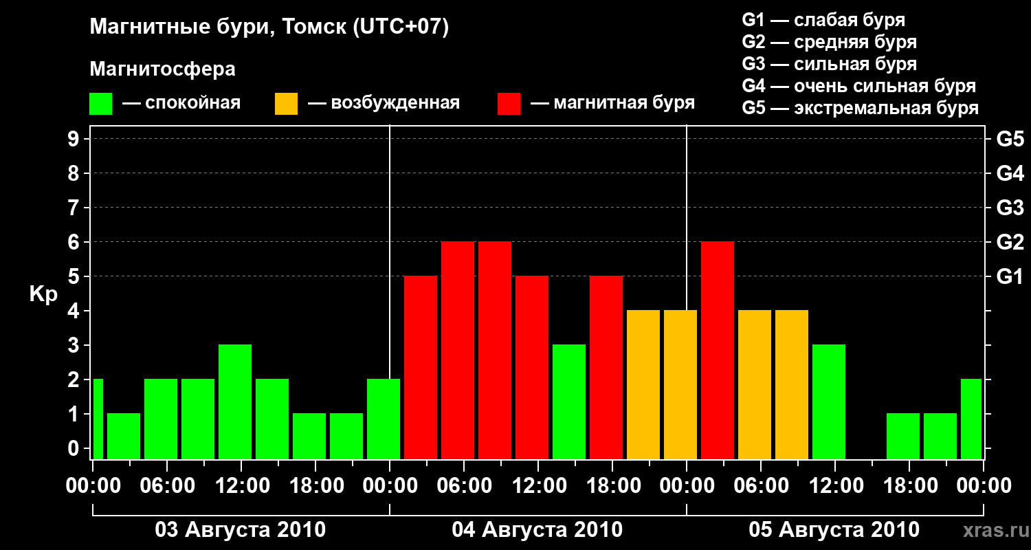 Изменения геомагнитного индекса Kp с 3 по 5 августа 2010 года для средних широт