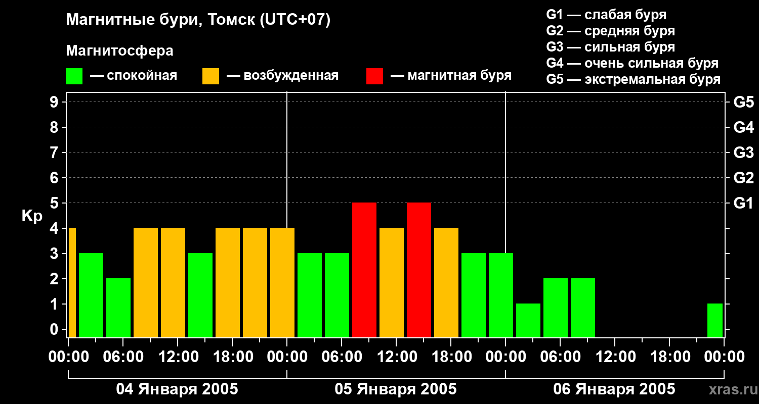 Изменения геомагнитного индекса Kp с 4 по 6 января 2005 года для средних широт