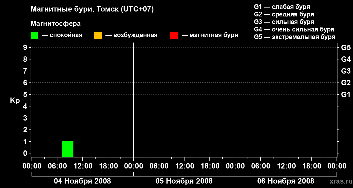 Изменения геомагнитного индекса Kp с 4 по 6 ноября 2008 года для средних широт
