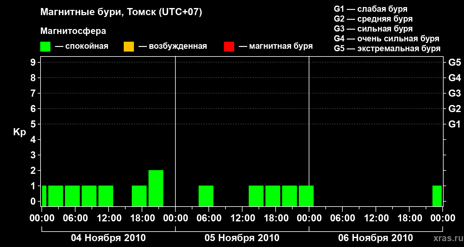 Изменения геомагнитного индекса Kp с 4 по 6 ноября 2010 года для средних широт