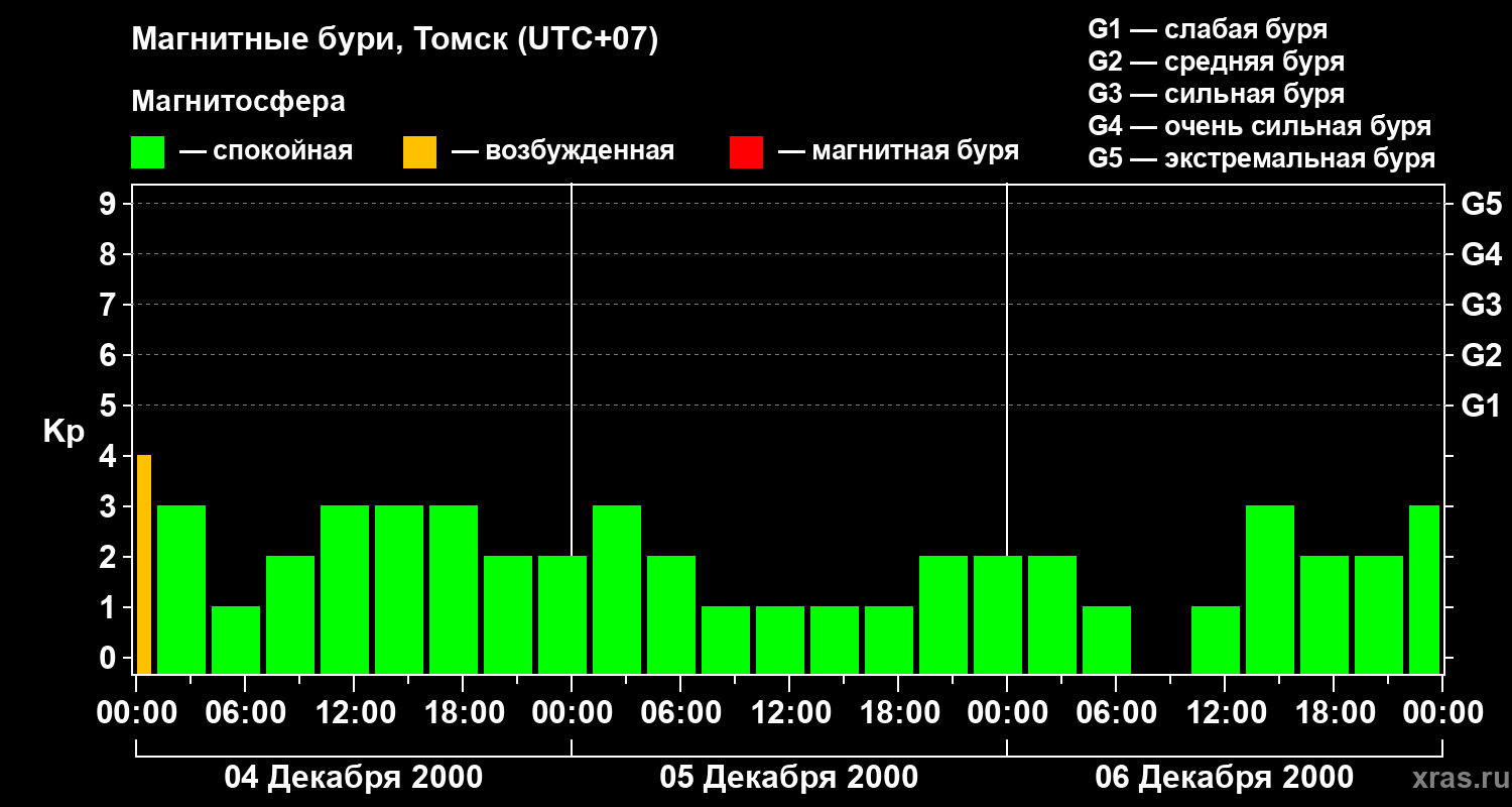 Изменения геомагнитного индекса Kp с 4 по 6 декабря 2000 года для средних широт