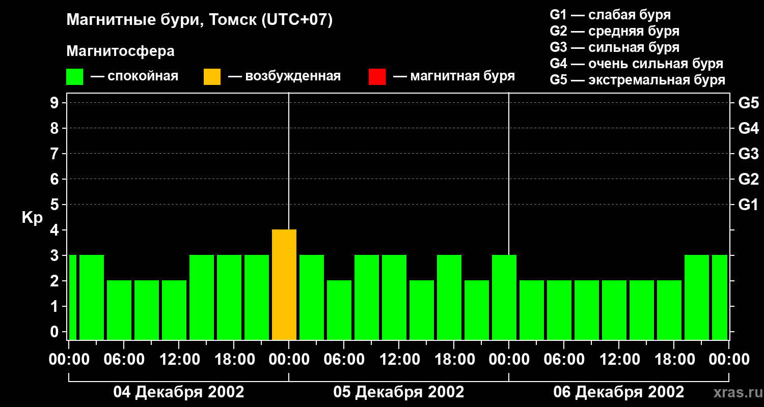 Изменения геомагнитного индекса Kp с 4 по 6 декабря 2002 года для средних широт