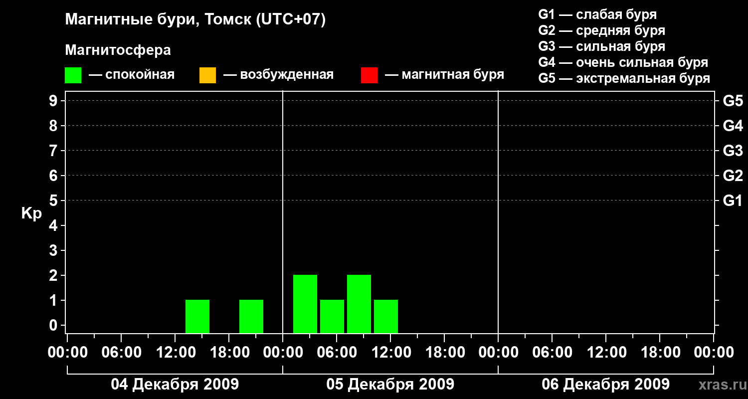 Изменения геомагнитного индекса Kp с 4 по 6 декабря 2009 года для средних широт
