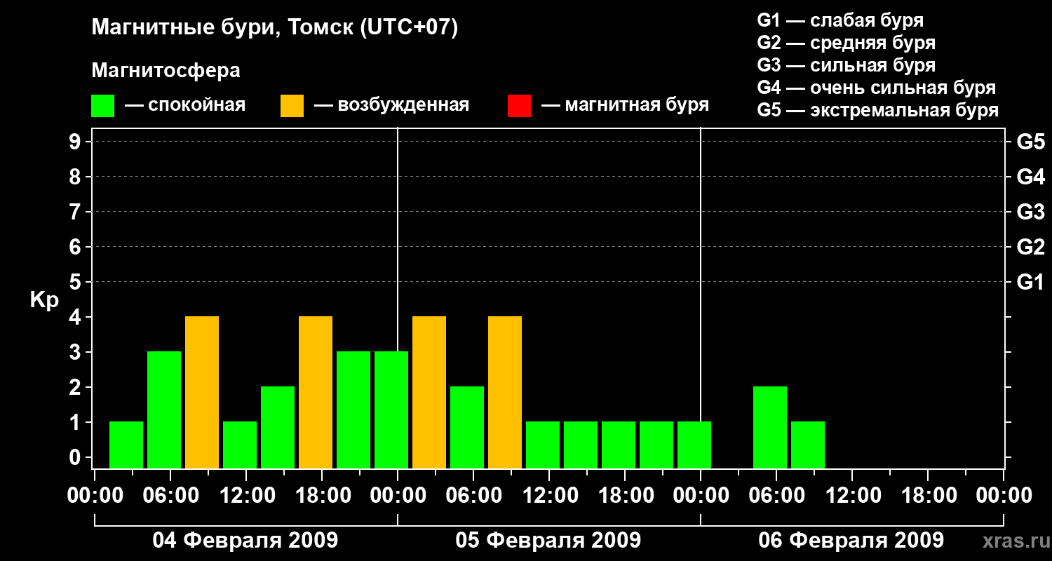 Изменения геомагнитного индекса Kp с 4 по 6 февраля 2009 года для средних широт