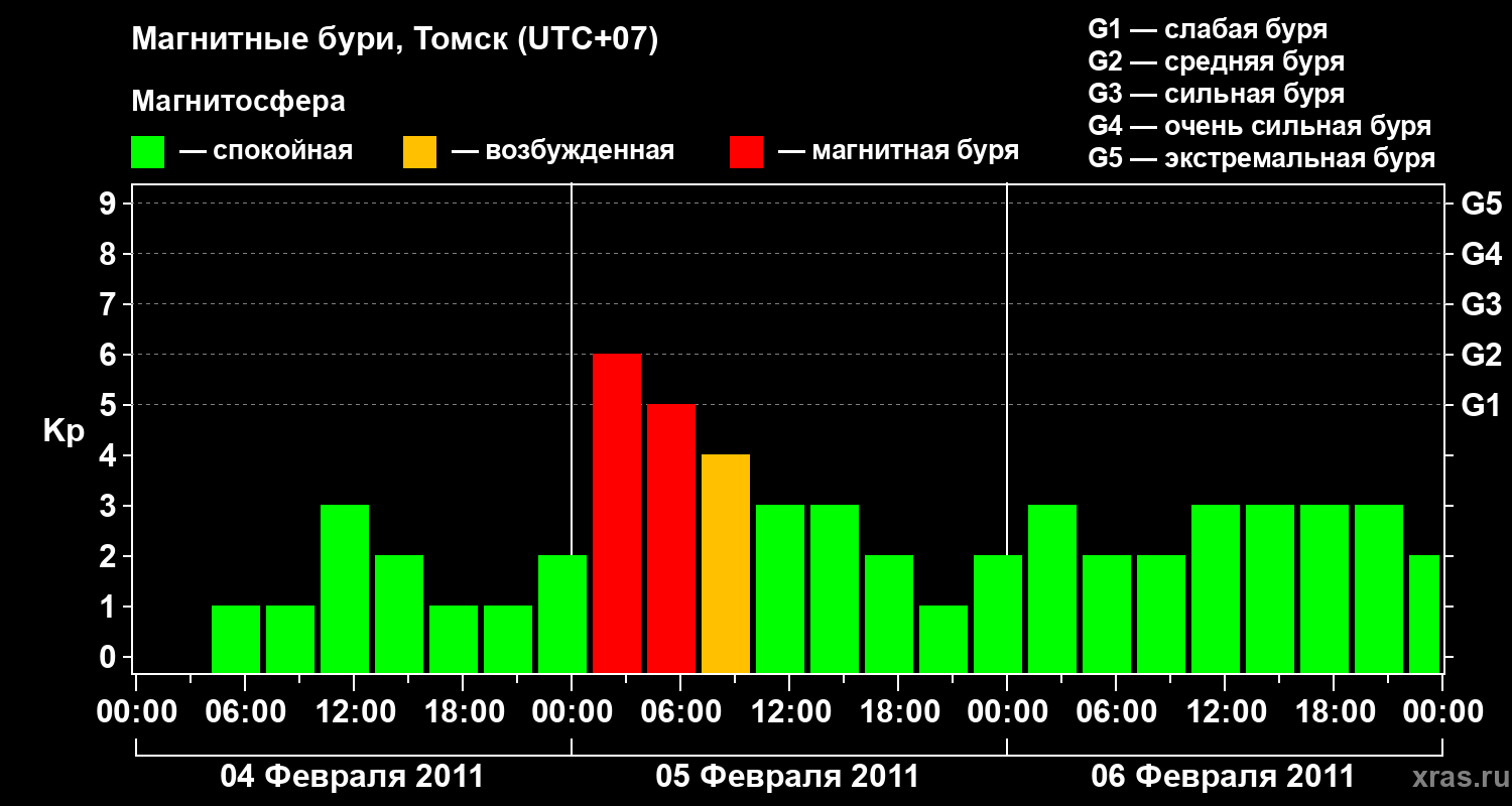Изменения геомагнитного индекса Kp с 4 по 6 февраля 2011 года для средних широт