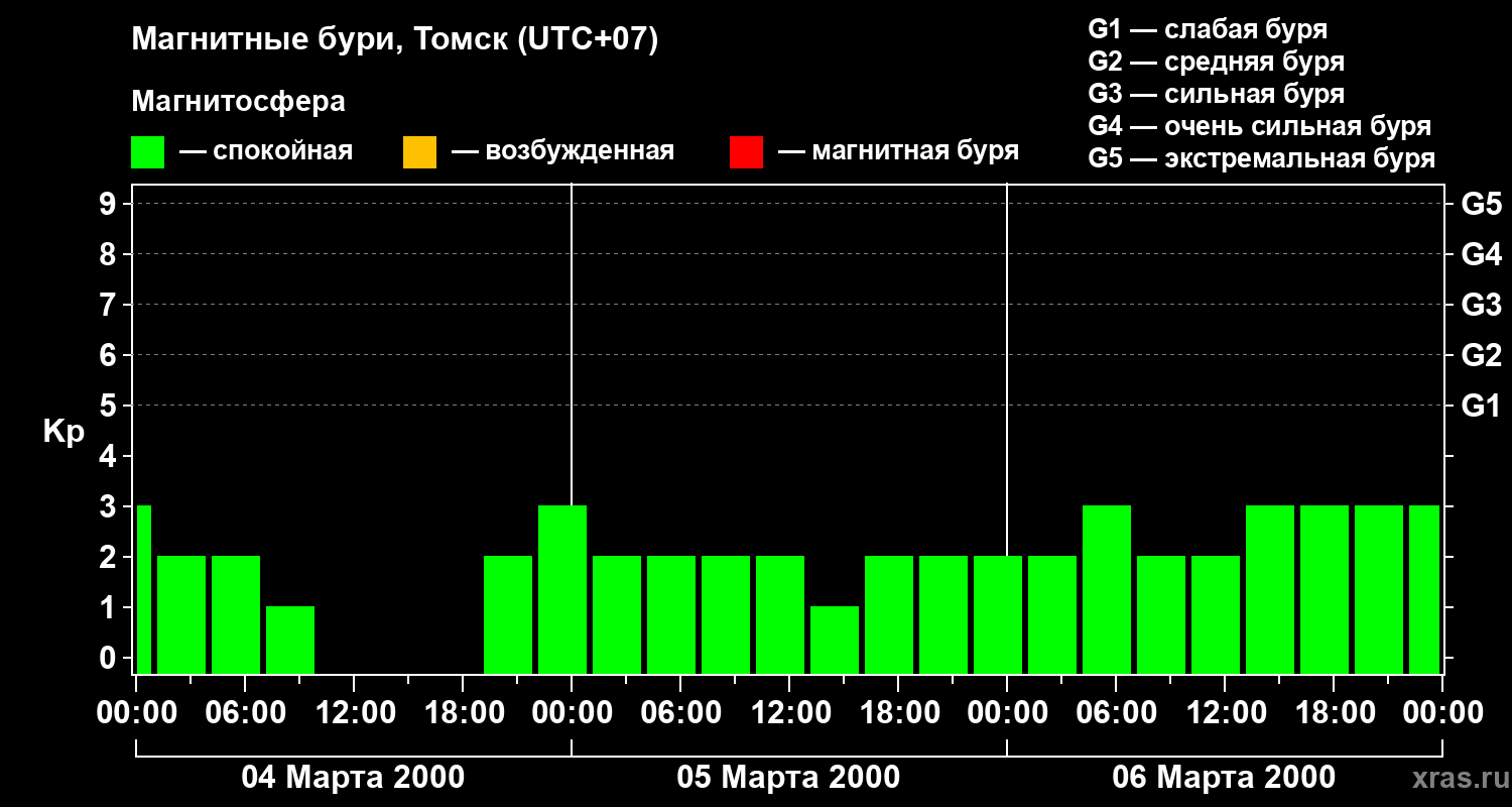Изменения геомагнитного индекса Kp с 4 по 6 марта 2000 года для средних широт