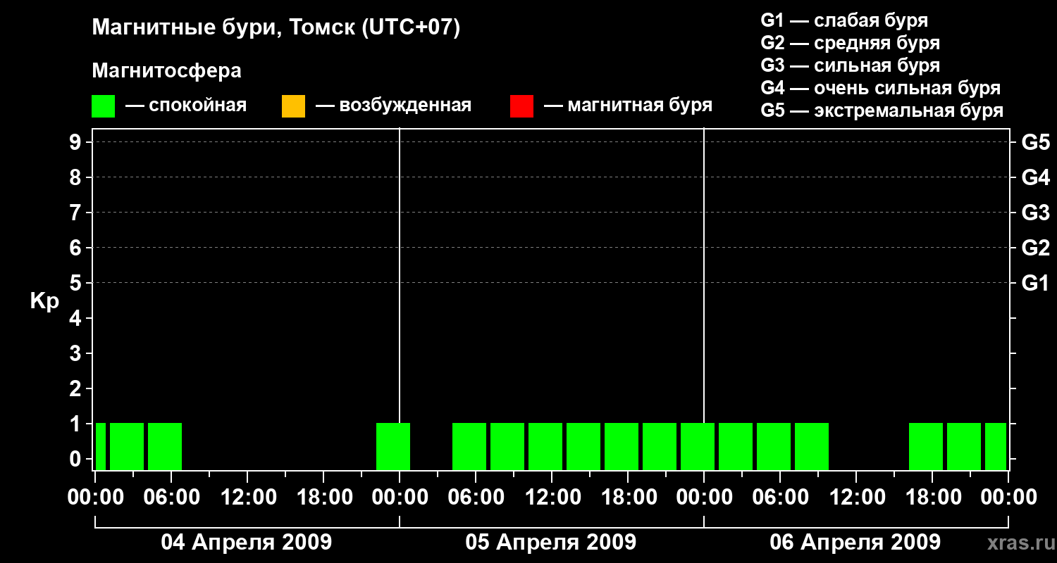 Изменения геомагнитного индекса Kp с 4 по 6 апреля 2009 года для средних широт