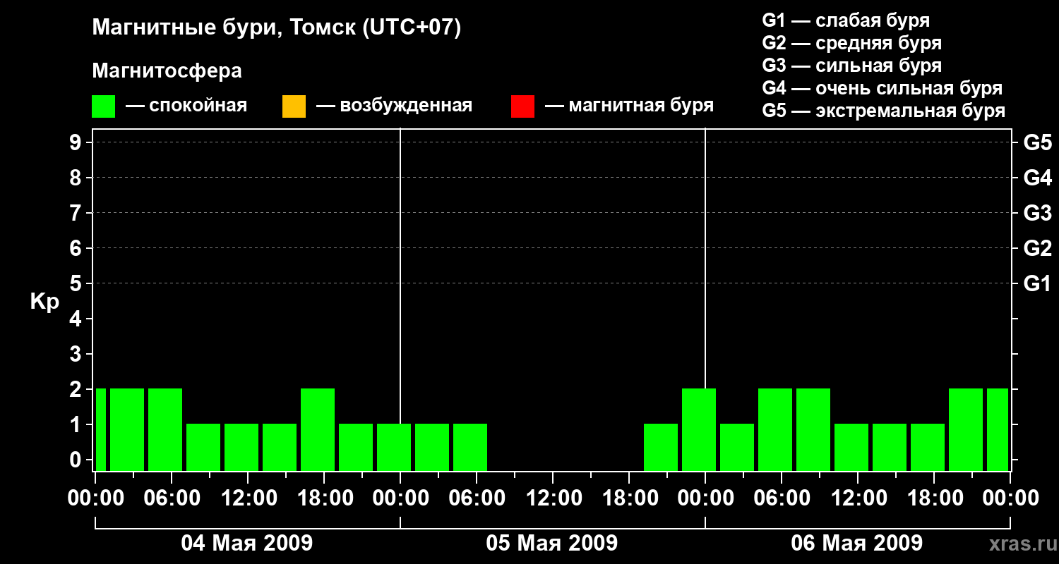 Изменения геомагнитного индекса Kp с 4 по 6 мая 2009 года для средних широт