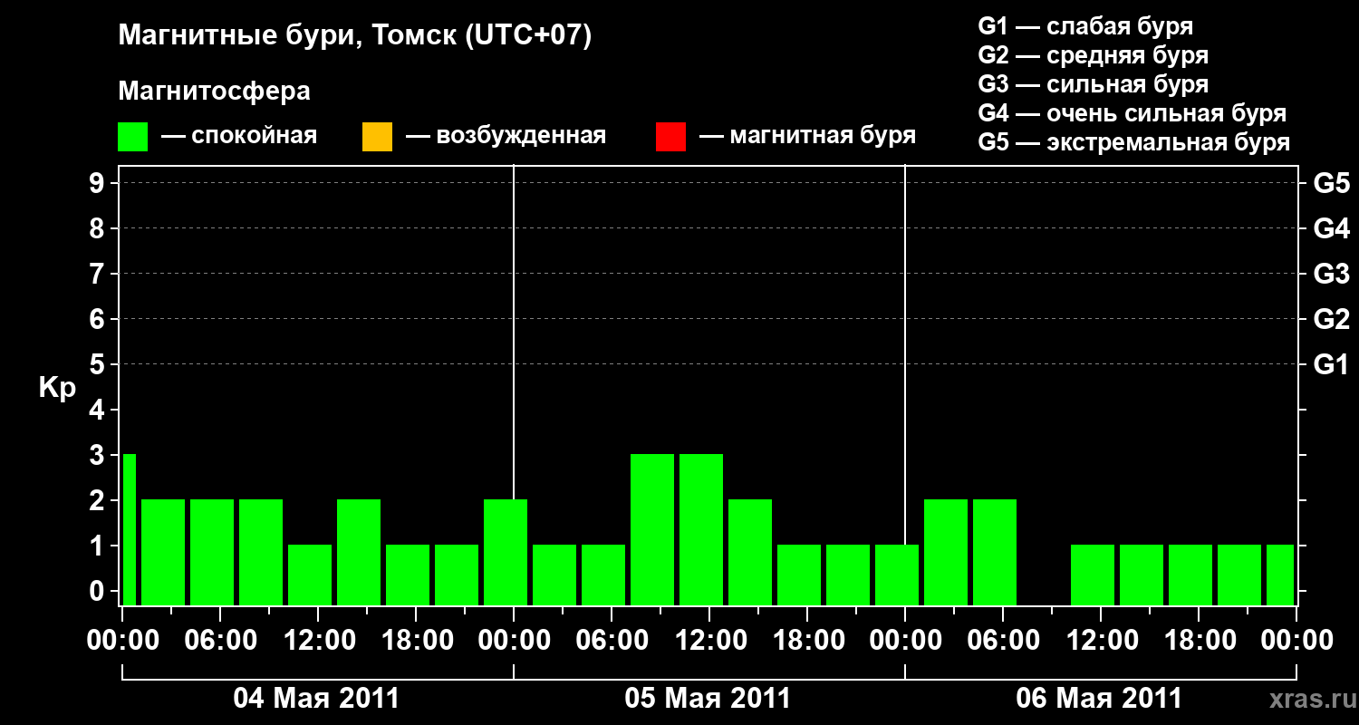 Изменения геомагнитного индекса Kp с 4 по 6 мая 2011 года для средних широт