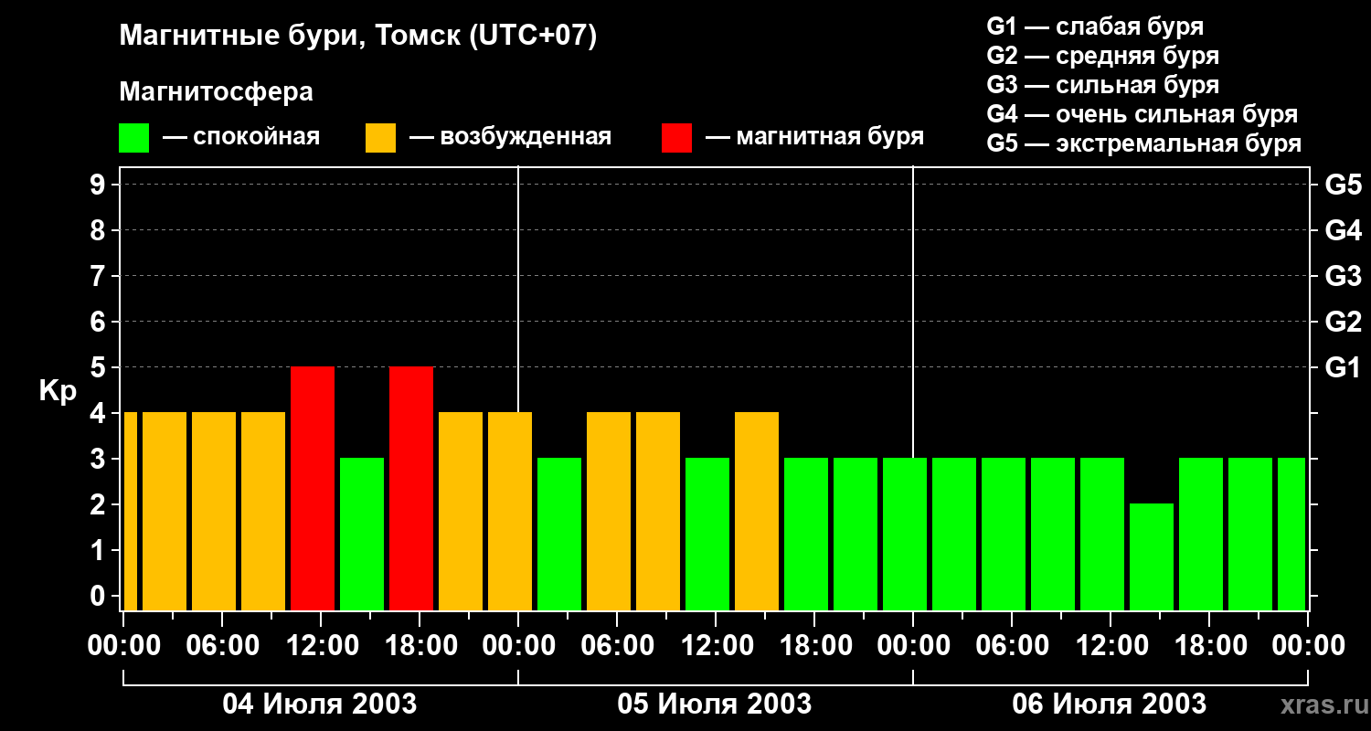 Изменения геомагнитного индекса Kp с 4 по 6 июля 2003 года для средних широт