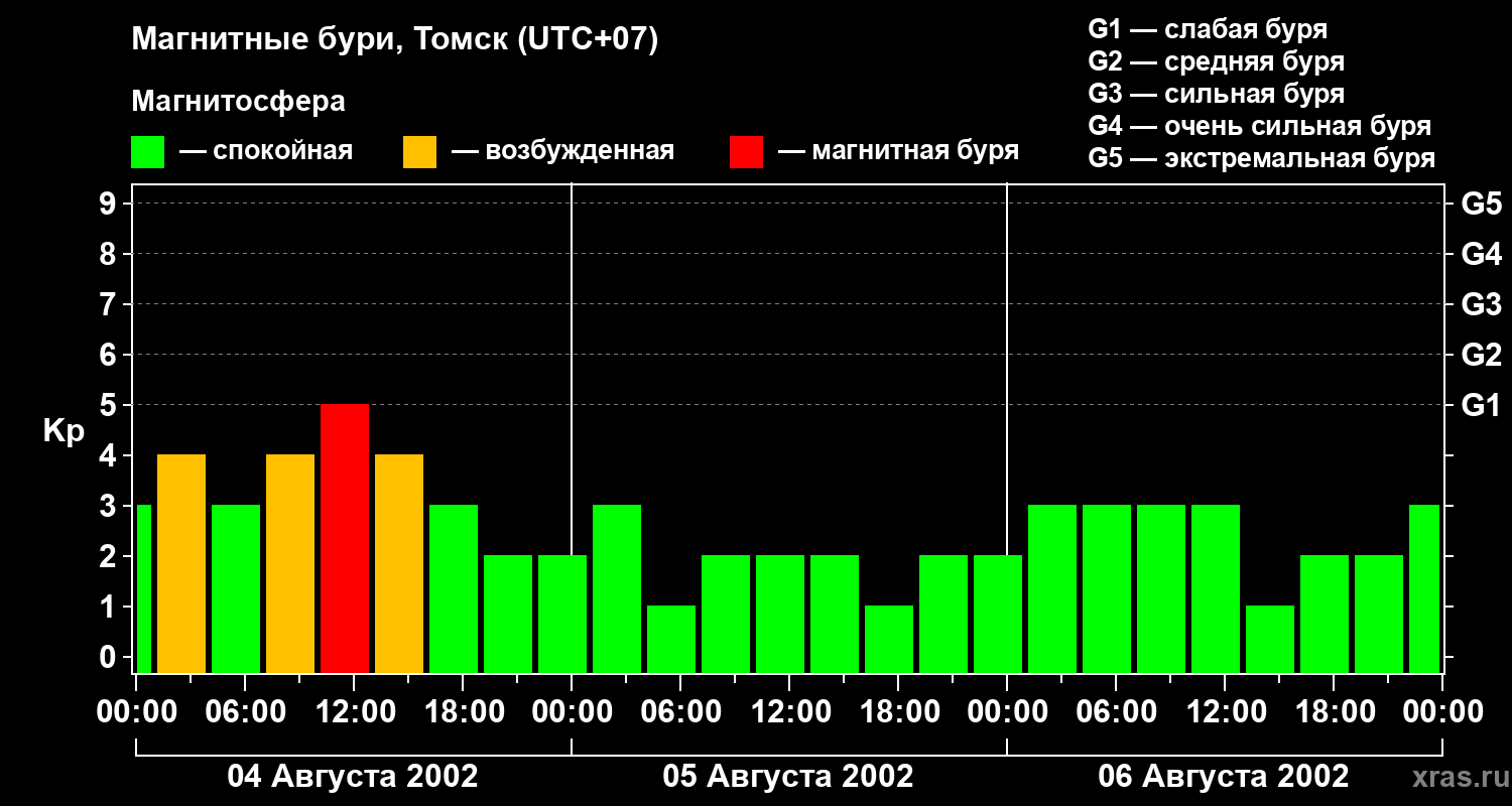 Изменения геомагнитного индекса Kp с 4 по 6 августа 2002 года для средних широт