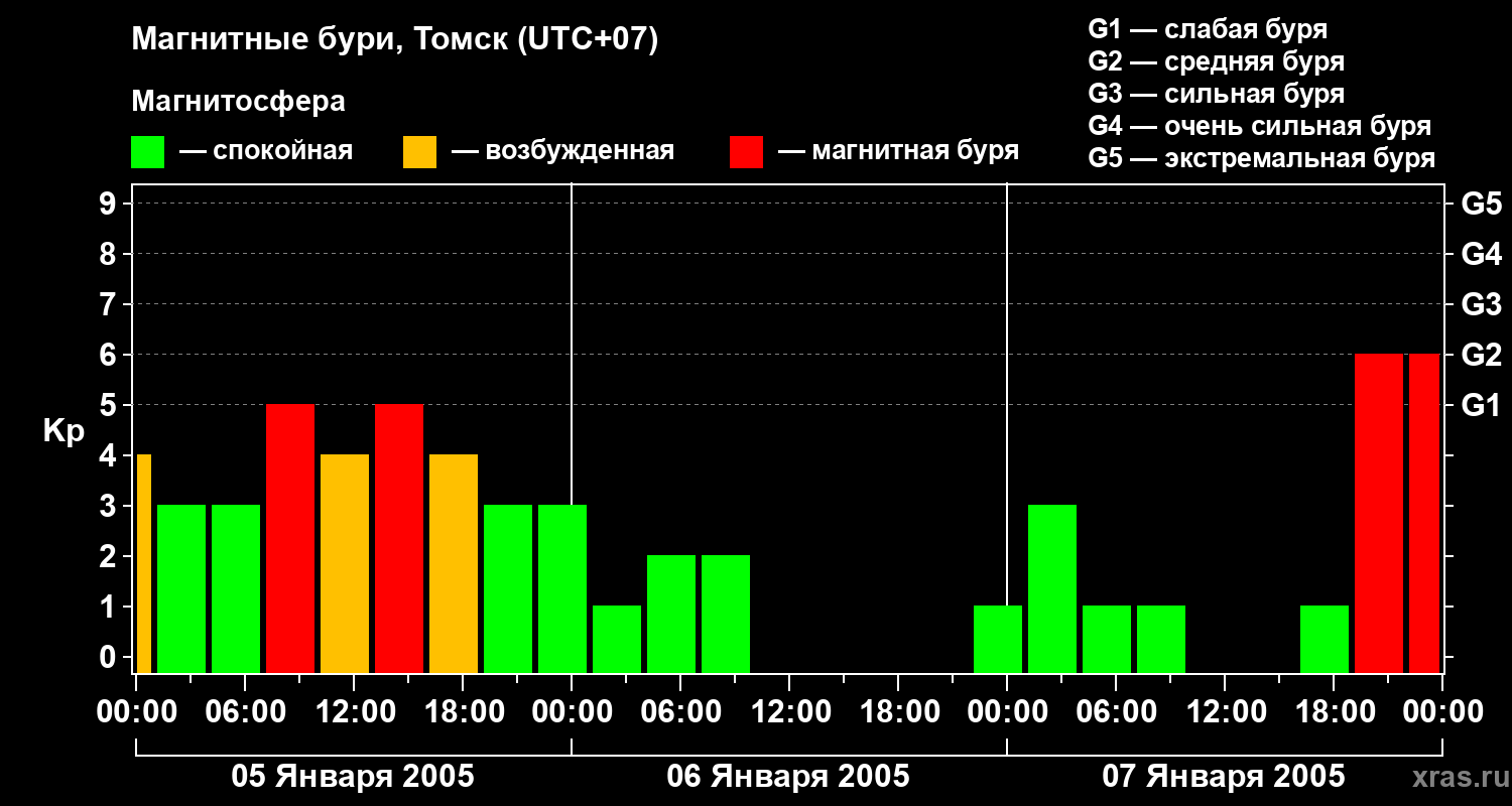 Изменения геомагнитного индекса Kp с 5 по 7 января 2005 года для средних широт