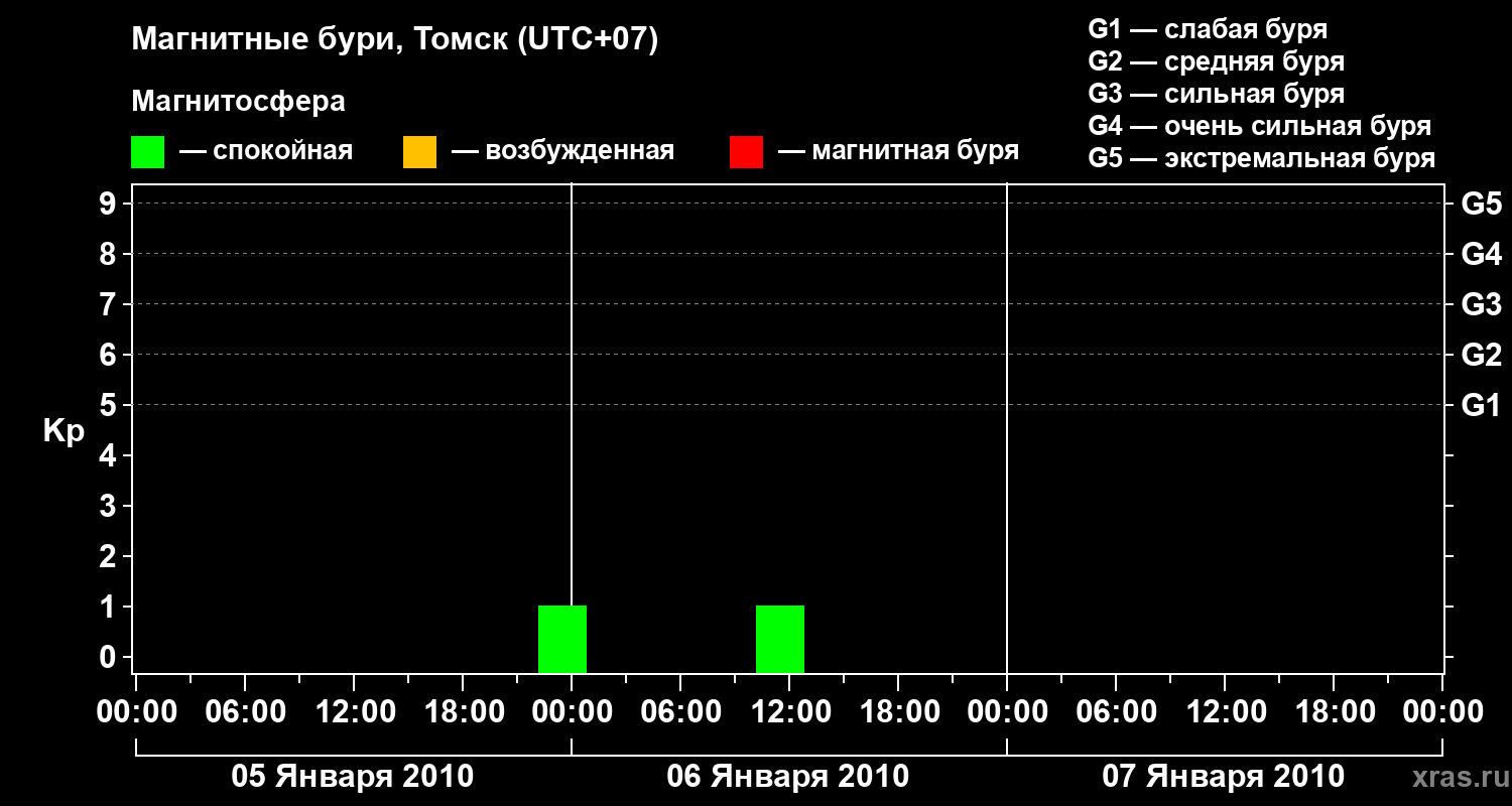 Изменения геомагнитного индекса Kp с 5 по 7 января 2010 года для средних широт