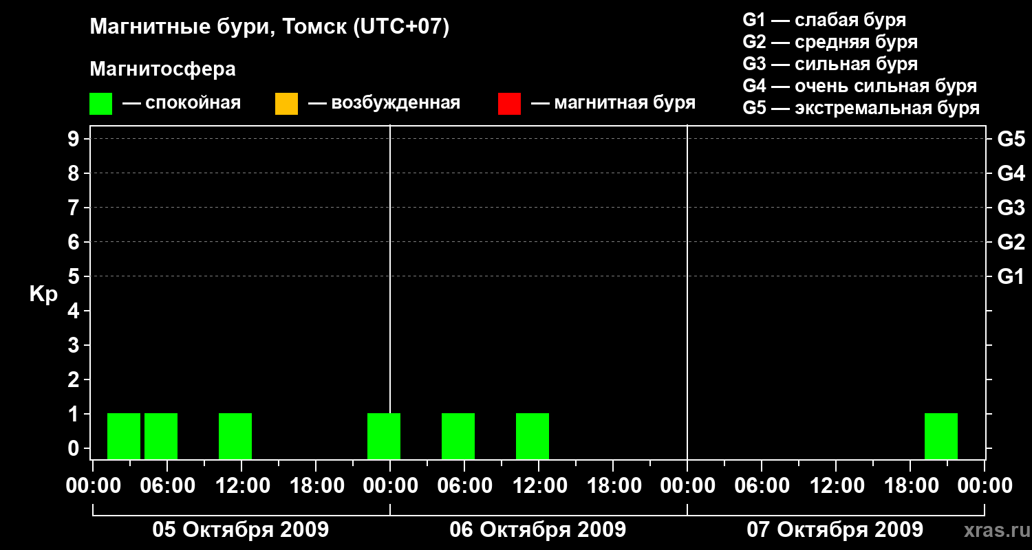 Изменения геомагнитного индекса Kp с 5 по 7 октября 2009 года для средних широт