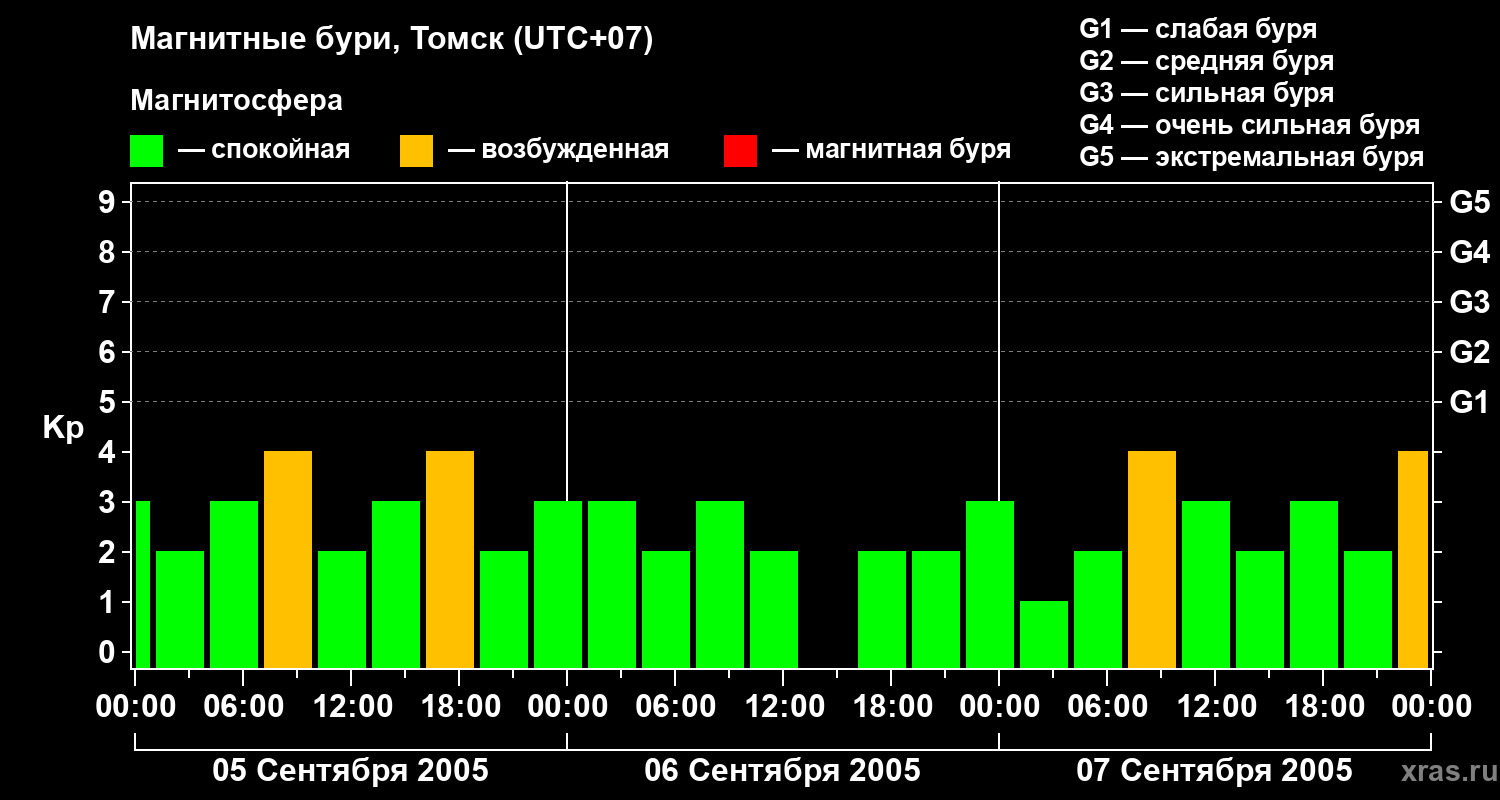 Изменения геомагнитного индекса Kp с 5 по 7 сентября 2005 года для средних широт