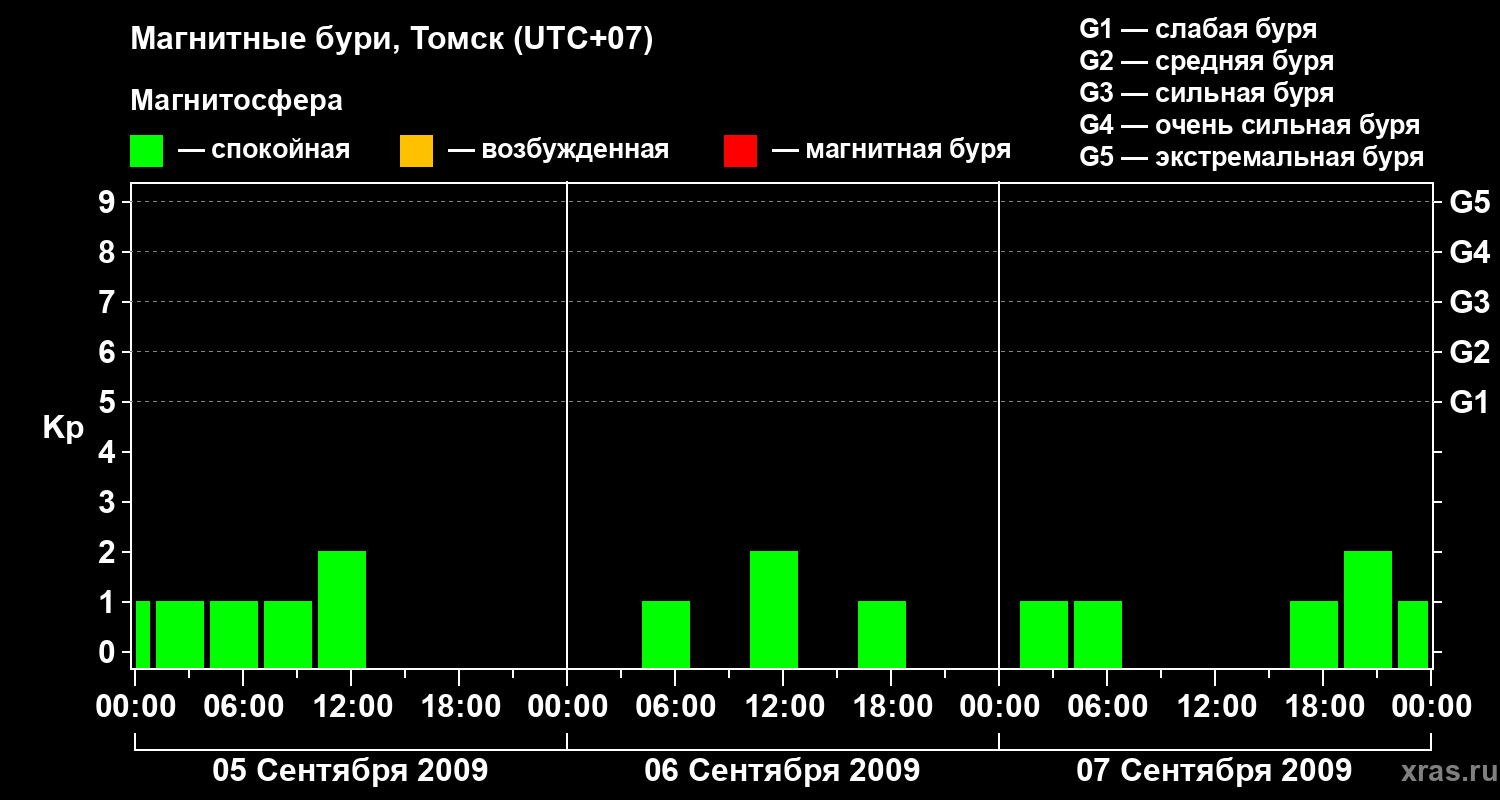 Изменения геомагнитного индекса Kp с 5 по 7 сентября 2009 года для средних широт