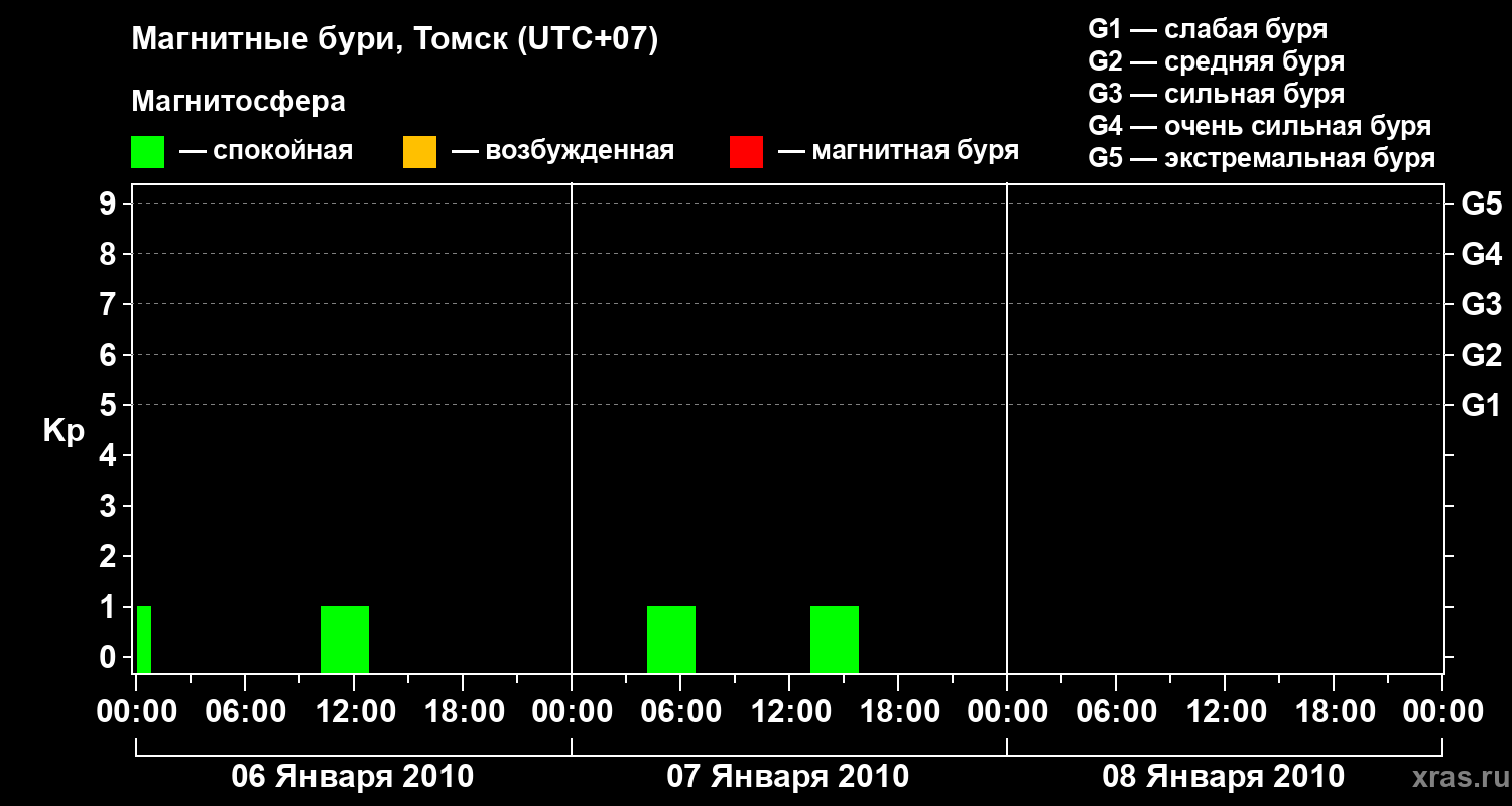 Изменения геомагнитного индекса Kp с 6 по 8 января 2010 года для средних широт
